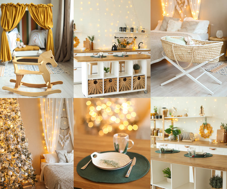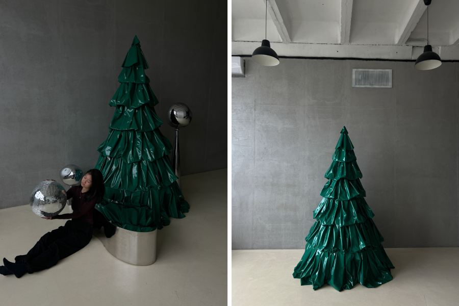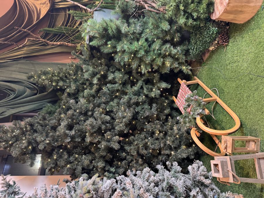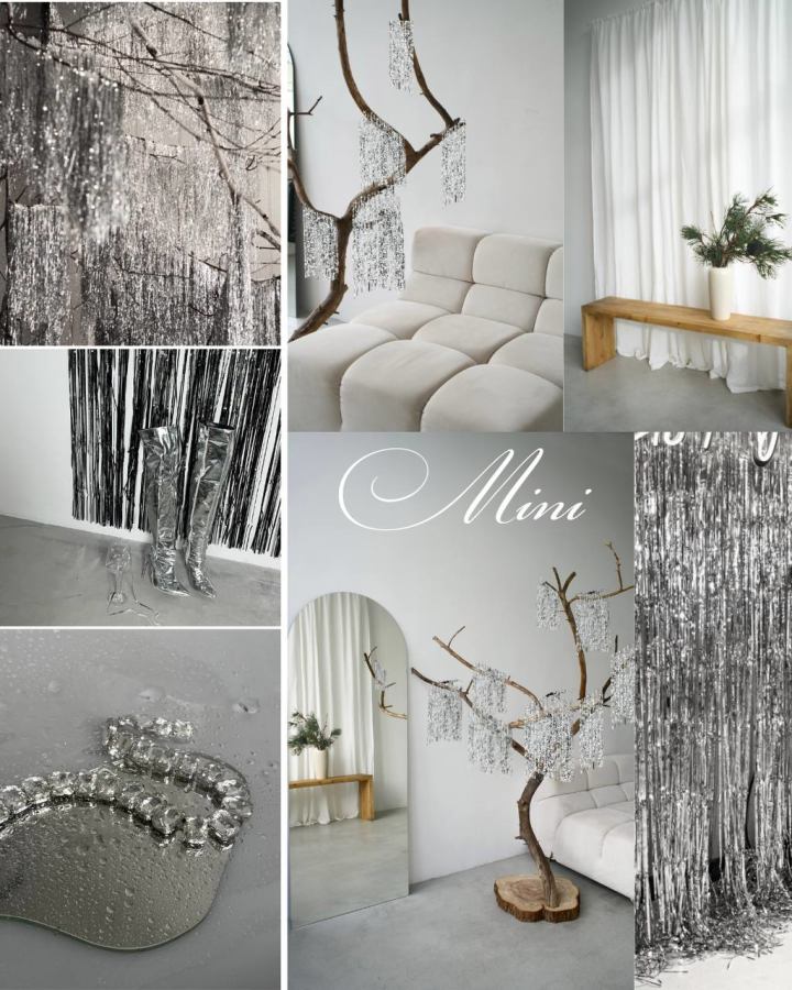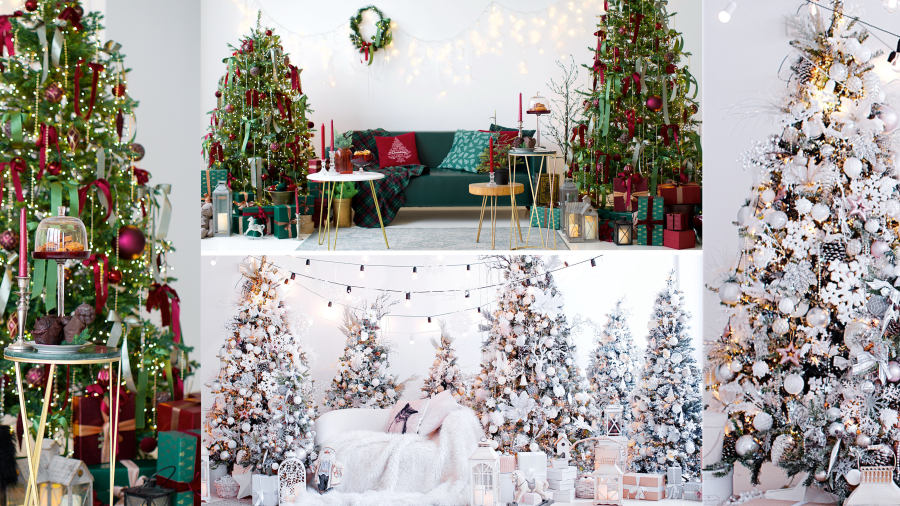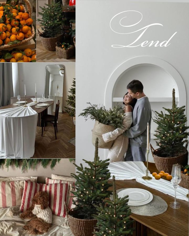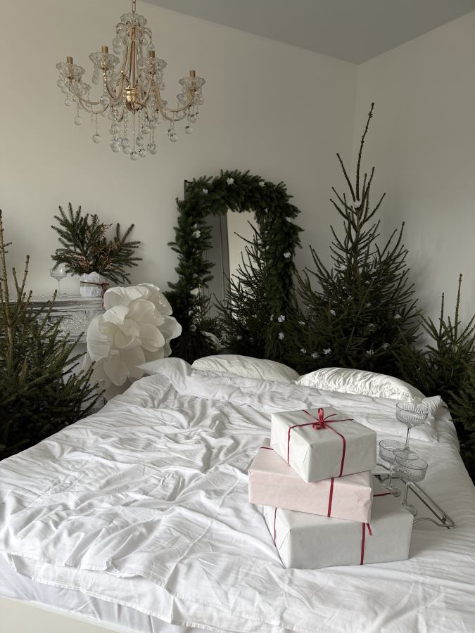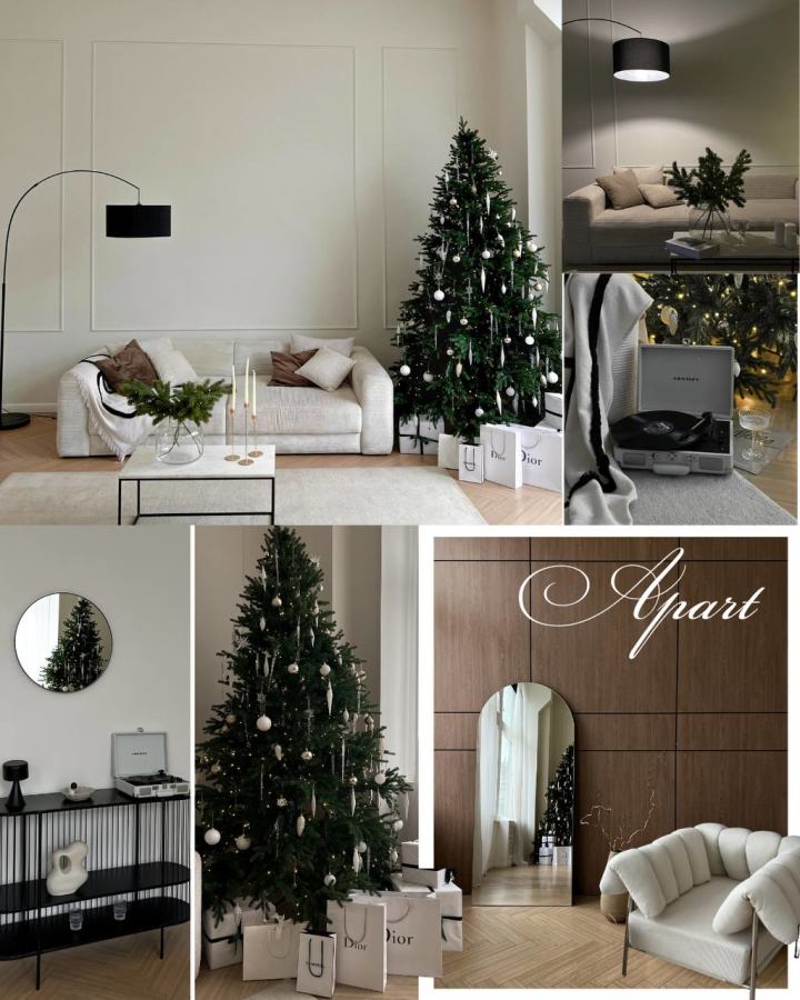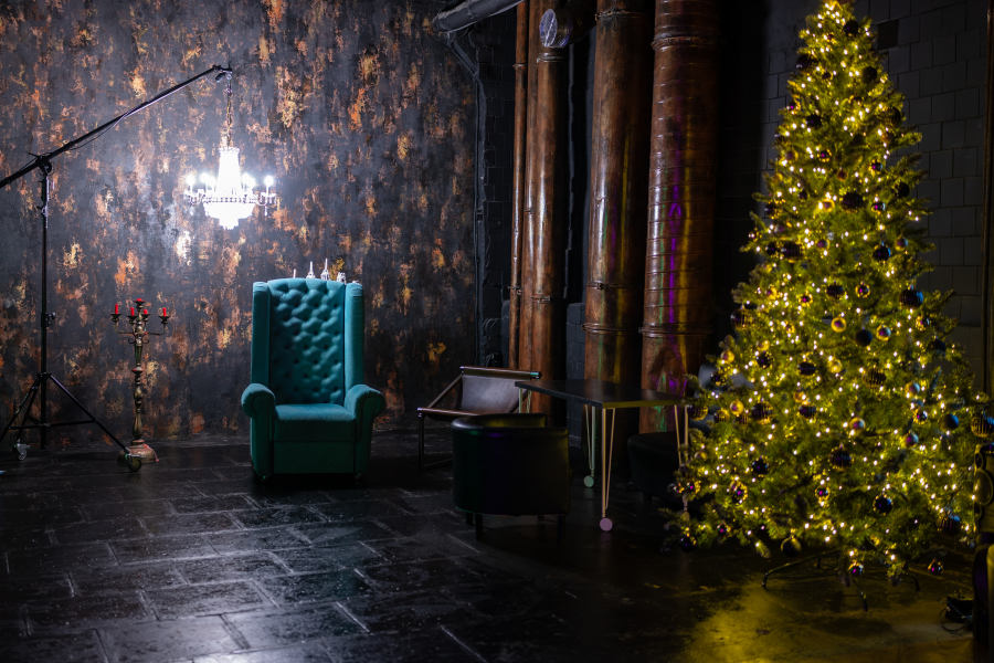 Заснеженная елка с красным бантом и множество новогодних элементом минималистично украшающих зал)Забронировать зал: https://photozall.ru/apart...