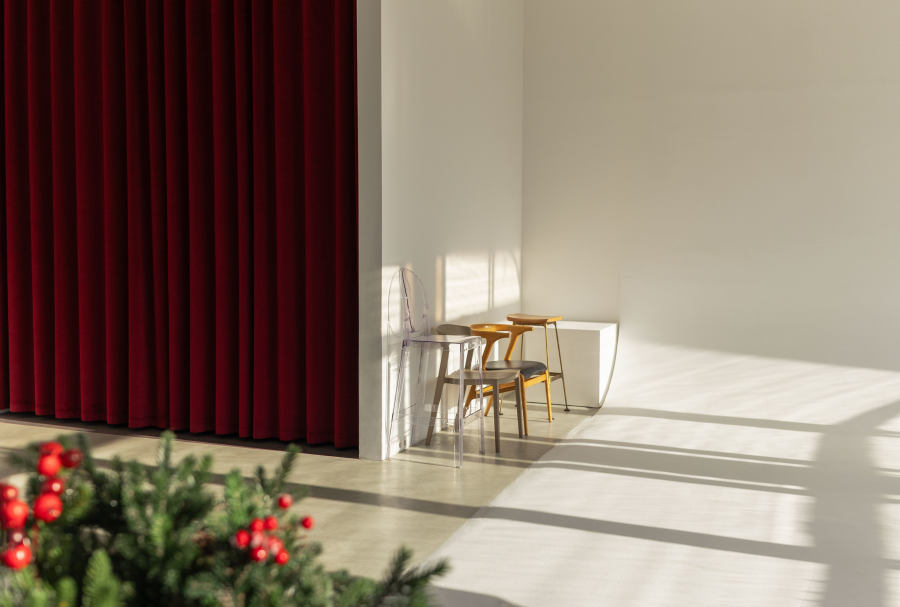 Традиционно залы с циклорамой остаются без декора. В зал Slate мы добавили немного новогодних цветов и заменили бежевую штору перегородку на бордовую. Подробно ознакомиться с залом можно на нашем сайте https://onetake-studio.com/slate...