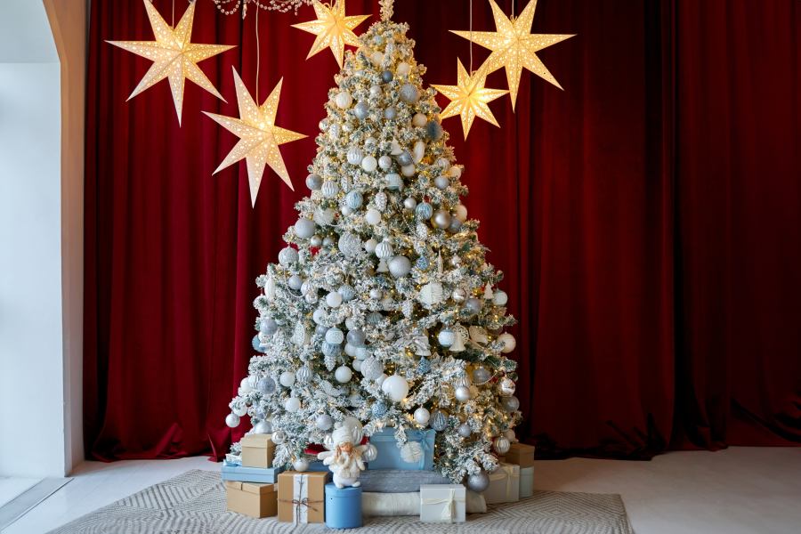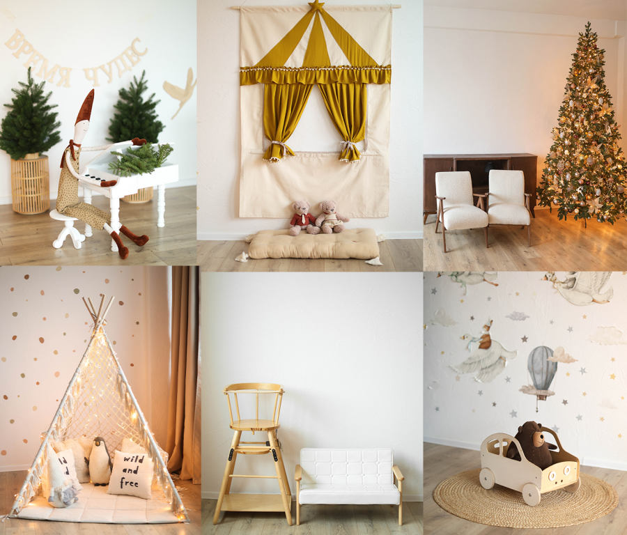 В залах "Гранд" и "Квартира" установлен декор и полноценные елки, в зале с циклорамой можно использовать искуственный снег с оптической насадкой в виде круга для световых эффектов, так же в любой зал можно установить красный фон с красным бантом из бархата....