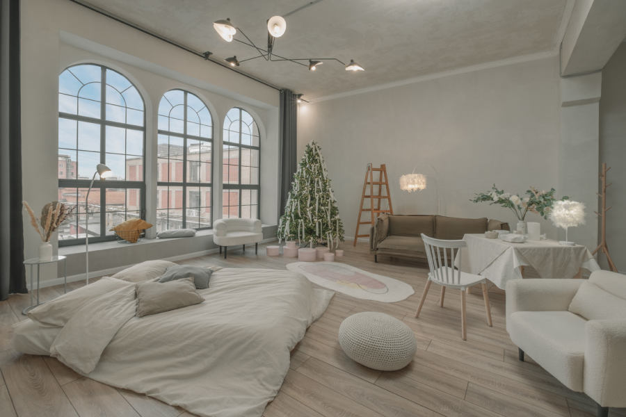 В духе современных апартаментов. Натуральные текстуры, идеальный светЗал 2в1 : продуманная интерьерная зона и фоны для съемок каталогов - бетонная & чистая белая пустая стена ...