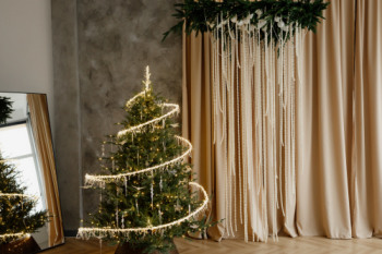 Заснеженная елка с красным бантом и множество новогодних элементом минималистично украшающих зал)Забронировать зал: https://photozall.ru/apart...