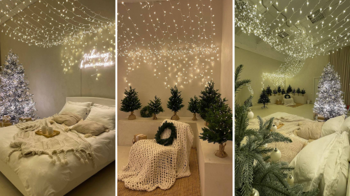 Заснеженная ель у кровати, мягкий вязаный плед, гирлянды и неоновая надпись создают ощущение настоящего рождественского утра.