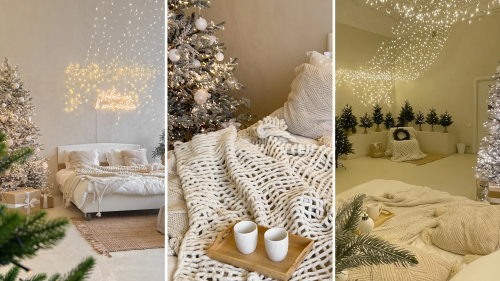 Светло-бежевый интерьер, белоснежное постельное бельё, мягкий текстиль и миллионы тёплых огоньков создают атмосферу зимнего утра без суеты.
