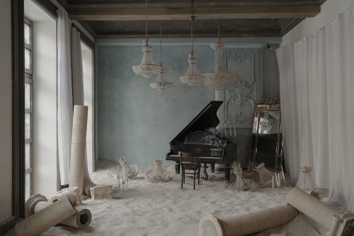 Вокруг расставлены декоративные элементы: свечи, создающие атмосферу уюта, изысканные старинные колонны, добавляющие нотку утонченности и величественности. И хрустальные люстры, парящие над роялем, создают волшебное сияние и отражение в винтажном зеркале.