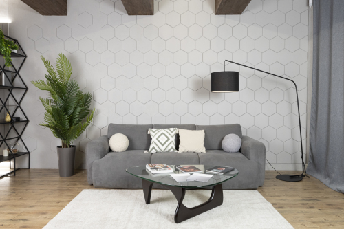 На одной из стен в зоне гостиной установлены панели с внутренней подсветкой, что создает эффектный световой акцент и придает интерьеру особый шарм. Противоположная стена оформлена фактурной поверхностью, добавляющей интерес к общему дизайну зала.