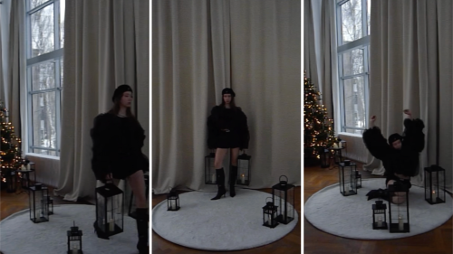 Эстетичные фонарики со свечами, белый ковёр, паркет «ёлочкой» и много воздуха — идеальный сет для новогодней съемки.