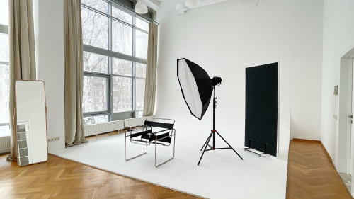 100 м² воздуха, панорамные окна на две стены, паркет «ёлочкой» и белые стены — максимум света и свободы для съёмки.