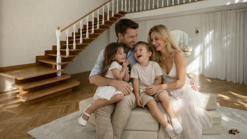 много естественного света, теплый деревянный пол елочкой, окна в пол и то самое ощущение загородного дома. дети бегают, родители смеются, кадр получается сам!