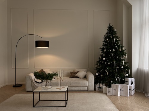Минималистичный светлый интерьер в стиле апартаментов. В зоне с диваном украшенная ёлка с элементами жемчужных бус. На журнальном столике небольшой ароматный еловый букет, свечи, шахматы.