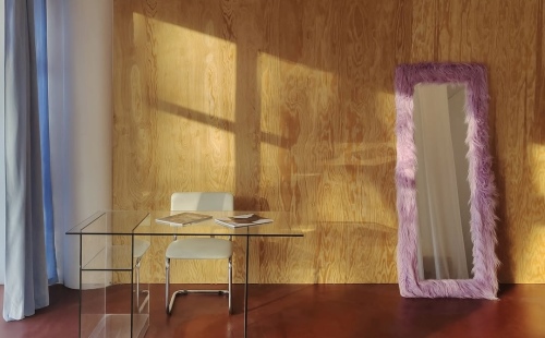 Красный пол, хвойная фанера с неповторимым рисунком, пропитанная специальным маслом для яркой текстуры, голубые шторы и самое главное — одна деталь, которую мы пока не можем показать.