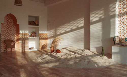 Зал Марокко с натуральным песком — пространство для тех, кто ищет необычные фактуры и атмосферу. Тёплый свет, пустынные мотивы, естественный рельеф. Идеально для творческих съёмок, продакшена, fashion-луков и обложек.