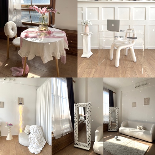 с 9 до 17/18 солнце в зале Мебель светлое букле Офисная зона Обеденная зона Зона гостиная с диваном Гримерный столик Зона с шелковой белой шторой и креслом Импульсный свет бесплатно в зале