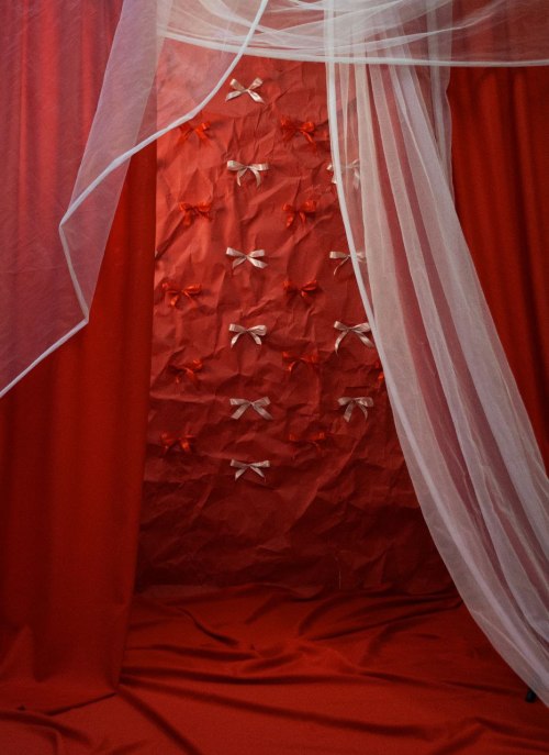 Красная локация в зале Уют - мятый фактурный бумажный фон красного цвета с ленточками-бантиками, красные ткани на полу и на стойке. Так же детали декора из белого фатина. Стойку с красными тканями можно двигать и убирать, чтобы снимать только на фоне фактурного бумажного фона с бантиками!