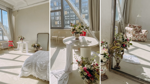 круглый стол как из пинтерест, огромное зеркало, цветы, кровать с жатым текстилем и воздушной драпировкой — здесь легко снимать утро, нежность, бренды и lifestyle.