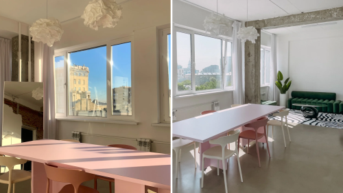 Розовый стол 2,7 метра, мягкий дневной свет из окон на две стороны и атмосфера, в которой хочется творить, болтать и отмечать.