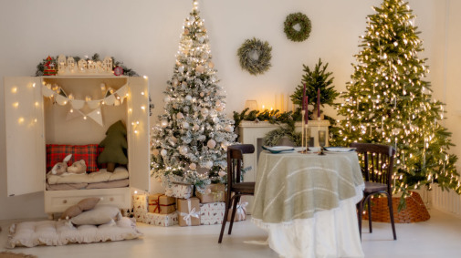 Новогодние декорации в светлом зале. В нашей студии царит атмосфера праздника! Две новогонодние фотозоны, множество детского реквизита. Детская спальня, подвесные качели кокон, качалка овечка, маленкие стульчики, вигвам и много игрушек. Циклорама....