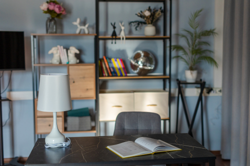 — продуманные детали интерьера — книги, зелёные растения, нейтральный декор