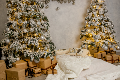 Создайте идеальную зимнюю фотографию в нашей уютной локации. Две роскошные заснеженные ёлки, украшенные серебряными шарами, хрустальными бусами и сверкающими сосульками, создают магический фон. Главная особенность — елки можно двигать, а пространство между ними заполнить на ваш выбор: