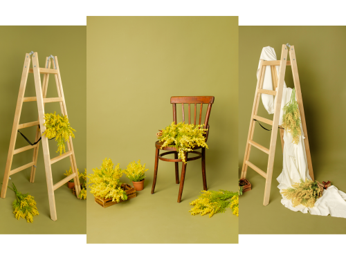 Подготовили для ваших съемок новый весенний уголок. Приятный зеленый фон, воздушная раскидистая мимоза и стильные лестница или ретро-стул создают идеальную атмосферу для кадров.