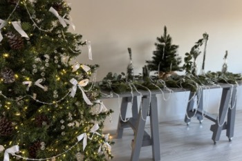 В зале Cozy новогодний декор!) Заснеженная елка с розовыми украшениями и подарками! На стенках заснеженные венки с розовыми бантиками!Новогодний декор можно двигать, важно к концу брони , вернуть все на места)Больше фото: https://photozall.ru/cozy...