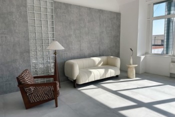 Зал в котором соединились бетон и дерево! Серая стена со вставкой стеклоблоков идеально подойдёт для съёмок на маркет плейс и фешн съёмок! В зале находятся: диван с деревянными эллемантами, дизайнерское кресло, каменный столик , зеркало арка и самый...