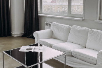 Минималистичная кухонная зона с раковиной и 2 конфорками для готовки (плита электро). Естественный рассеянный свет от больших окон добавляет мягкости серым оттенкам интерьера, окна можно затемнить шторами блэкаут. Прекрасно подходит для любой контент...