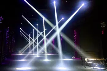 Более 30 приборов динамического света управляемых с пультов в большом черном 600 метровом зале....