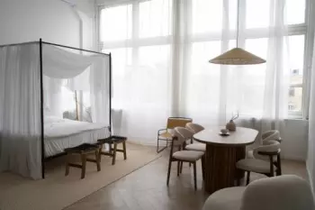 Теплый деревянный интерьер с кроватью и обеденной зонойСветлая минималистичная спальня, зона гостиной со столом и эстетичный декор...