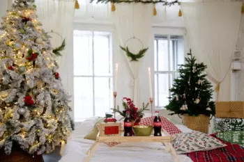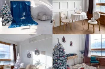 Зал "Cozy": Белые ели с розовыми игрушками, белые новогодние венки, белый новогодний декор!Зал "Serebro": В зале ёлка с серебряными украшениями, подсвечник серебро, зимнее дерево и бархатный синий фон...