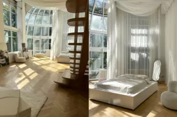 Air - светлый, интерьерный зал с купольным окном, белыми стенами и антресолью. Дополняют зал лестница, паркет ёлочкой, кровать и воздушные белые шторы, которые можно размещать в разных частях зала.☺️ ...