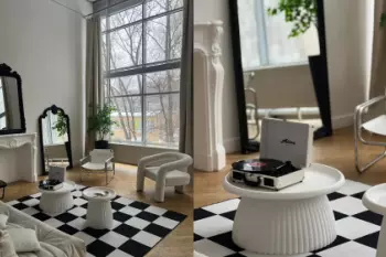Паркет «елочкой» натурального цвета и белые стены. Зал BANG идеально сочетает в себе нотки парижского шика и трендовую мебель в стиле баухаус, ваши снимки отсюда будут модными...