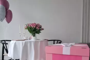 Большой букет тюльпанов, сервировка стола, шарики, коробка с надписью. Ждём вас на съёмку!...
