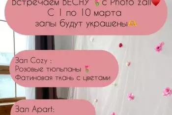 Встречаем ВЕСНУ с Photo zallС 1 по 10 марта залы будут украшены с легкой весенней тематике Декор можно двигать, но важно к концу аренды все вернуть на места Зал Cozy :Розовые тюльпаныФатиновая...