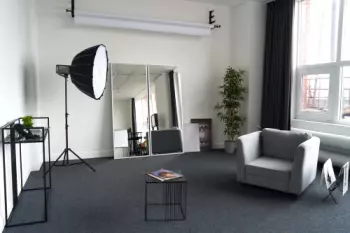 Просторный зал с кухней имеет и много других зон в разных тонах светлых, темных, с подсветкой, большие окна которые дают много естественного света и имеется профессиональное оборудование Profoto, Aputure...