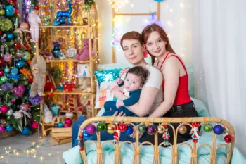 Новогодние декорации в светлом зале. В нашей студии царит атмосфера праздника! Две новогонодние фотозоны, множество детского реквизита. Детская спальня, подвесные качели кокон, качалка овечка, маленкие...