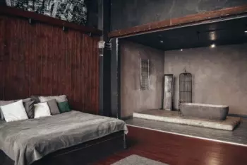 Огромные панорамные окна, напротив которых стоит большая уютная кровать, есть у нас в зале FLAT. Но это не все!Какие еще фотозоны есть в зале? Дизайнерская бетонная ванна, которую можно наполнять горячей...