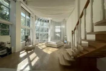 Окна в пол по периметру, одно купольное окно, 70 м² площади по первому этажу, антресоль 16 м², лестница, паркет ёлочкой, кровать и нежные светлые тона. Все это зал Air. Забронироытвь зал...
