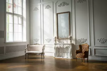 Работающий камин в зале KINGTON. Окунитесь в атмосферу викторианской эпохи и проведите съемку в стиле ретро в нашей фотозоне с камином. В зале также есть панно с цветами в бордовом цвете, деревянные стулья,...