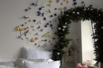 В зале Pure стоит двухметровая живая сосна, серебристый камин с большими белыми цветами, а зеркало в полный рост украшено еловой гирляндой с белыми маленькими цветами. ...