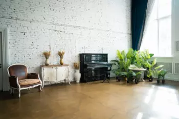 Просторная гостиная в стиле лофт с уютным камином и большой люстрой замечательно подходит для любой фотосессии и съемки видео. Кирпичная фактурная стена со старинным фортепиано и зелёными растениями создает...