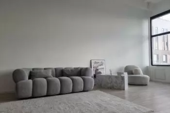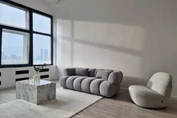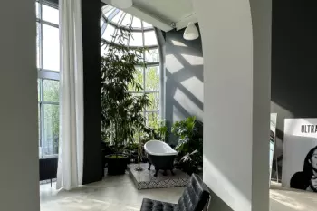 60 м² пространства для творчества с большим купольным окном и аркой. Бетонный пол, белая и серая и черная стены, белые рассеивающие шторы. Локации: современная модная мебель в стиле баухаус:...