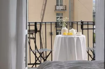 Парижский балкон в зале Эрмитаж! С балкона открывается вид на сад Эрмитаж, высотки арбата и сталинки На балконе два черных стула и засервированный стол с белой скатертью Зал Эрмитаж, м. Маяковская...