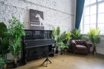 Просторная гостиная в стиле лофт с уютным камином и большой люстрой замечательно подходит для любой фотосессии и съемки видео. Кирпичная фактурная стена со старинным фортепиано и зелёными растениями создает...
