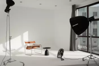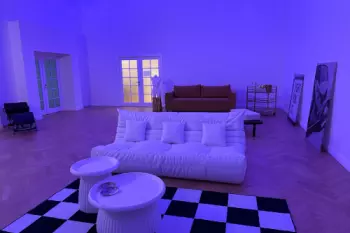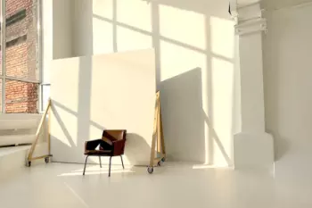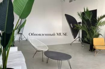 Теперь в зале MUSE появилась небольшая белая циклорама 3,5 на 3,5 метра Также в зал добавили белое кресло в стиле баухаус и торшер MUSE - широкий светлый зал 70 м² с циклорамой, белыми стенами...