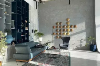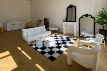 Интерьерный зал 86 м² со светлыми стенами и дизайнерской мебелью Локации: вместительный белый велюровый диван клетчатый ковер, камин, дизайнерские кресла и стулья, журнальный столик, цветок;...