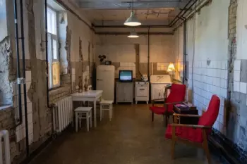 Атмосфера старых комнат эпохи СССР, заброшенная квартира. Спальня с металлической кроватью, ковром на стене, ламповым телевизором и старой медицинской лампой – это особое творческое пространство....