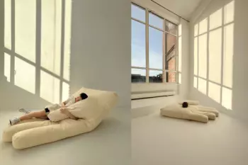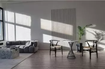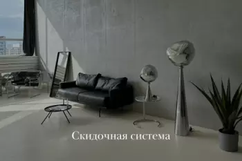 Просторный зал 58 м², минималистичный и светлый. В зале есть три стены: белая, серая бетонная и серая под плитку. В зале также есть черный кожаный диван, два металлических торшера, дизайнерское...