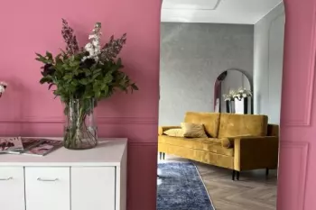 Просторный интерьерный зал Vivid с розовой стеной, горчичным диваном, зеркалами различной формы и множеством живых цветов! Зал Vivid идеально подойдет тем, кто устал от минимализма, белого цвета...