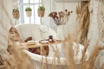 В зале Wild Roses шторы, имитация бетонной стены, разные шторы, зона с растениями и сухоцветами, дизайнерская мебель, изумрудная стена с винтажными рамками, мраморная ванная, трюмо и переносные тканевые...