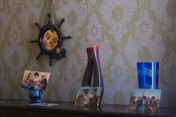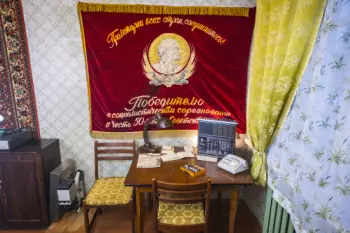 Кабинетный интерьер в стиле 70х. Хотите оригинальные фотографии? Вам сюда! Письменный стол, настольная лампа, радиоприемник, карты и домино, письменные принадлежности, проигрыватель пластинок, уголок...